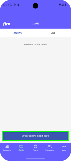 As a full user you may order your debit card at any time from the flame section of the app or the main menu. Your card will usually arrive in five business days. Fire debit cards may be used anywhere you see the MasterCard® logo – in store, online, for recurring bills and at ATMs for cash withdrawals. When your card arrives, you must activate the card by following the instructions in the app and letter.